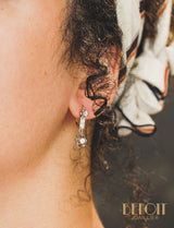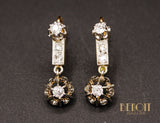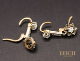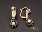 Boucles d'oreilles dormeuses en or jaune 750/1000e réhaussées de platine et composées premièrement d'un diamant taille ancienne d'environ 0,10 carat serti dans un chaton gaufré huit griffes en platine, positionné en haut d'une barrette pavée de deux diamants, au bout de laquelle est accroché un diamant taille ancienne d'environ 0,05 carat serti dans un chaton travaillé et assez imposant. Système dormeuse.