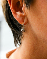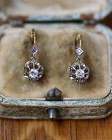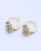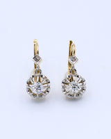 Dormeuses en or jaune 750 millièmes composées d'un diamant taille ancienne sur l'une et d'une taille moderne sur l'autre, sur chaton de platine, suspendu à un premier diamant taille rose. Système pour oreilles percées. Présence d'inclusions noires.