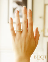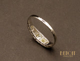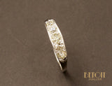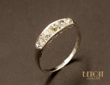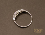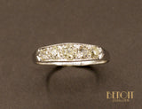 Bague jarretière en or blanc 750 millièmes sertie de cinq diamants taille ancienne et taille coussin sur platine soulignés de millegrain. Les flancs de la bague sont ajourés et ornés d'arabesques.Bijou de style et d'époque Art Déco de belle facture.