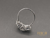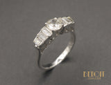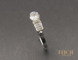 Bague jarretière de 1910 en argent, ornée d'un diamant taille ancienne, estimé environ J/K-VS, sur quatre griffes, épaulé de six diamants baguette de taille décroissante en mis clos. Les tranches sont ajourées géométriquement. Panier haut et joliment repercé. Les palmettes finissent sur le panier en goutte. Corps de bague simple, fin.