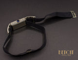 Montre en platine de style et d'époque Art Déco, composée d'un boîtier rectangulaire au cadran émaillé encadré d'un rang de diamants, ainsi que de deux éléments articulés ajourés de motifs géométriques sertis de diamants. Mouvement mécanique, en état de fonctionnement. Les flancs du boîtier sont aussi gravés de frises géométriques. Bracelet en tissu noir, cousu à la main sur la montre, librement réglable. Vendue avec son écrin d'origine, signé A. Hagneaux.