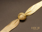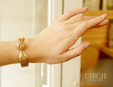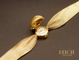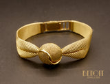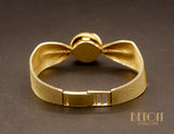 Bracelet-montre en or jaune 750 millièmes donnant l'illusion d'être noué autour du poignet, grâce à la maille milanaise souple du bracelet. Le boitier de la montre est recouverte par le "noeud" ouvrant, sur charnière, lui permettant d'être à la fois bijou et montre. Bijou élégant, de belle facture.