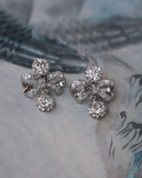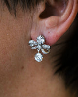 Sublime Paire de Boucles d'oreilles pendantes en Platine, en forme de Nœud stylisé entièrement pavé de Diamant taille brillant, encadré par le haut d'un Diamant taille ancienne d'environ 0.55 ct (légères inclusions) sur chaton tube et serti griffes et par le bas, en pendant, un deuxième Diamant taille ancienne d'environ 0.55 ct (Légères inclusions) serti griffe sur chaton gaufré. Bijou en très bon état. Système Smartlock en or blanc 750 millièmes pour oreilles percées.