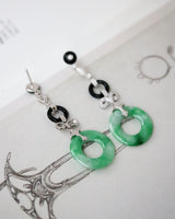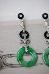 Élégante paire de boucles d’oreilles pendantes au design raffiné, composée d’éléments mobiles aux formes rondes et géométriques. Chaque boucle s’achève sur deux disques de jade mis en valeur par des volutes finement pavées de diamants en serti clos, grains et millegrain, suivi par un disque d’onyx surmonté à son tour de volutes scintillantes, pour se terminer par un dernier disque d’onyx monté en puce sur un système smart lock sécurisé. Un bijou au charme intemporel, en très bon état.