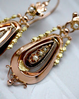 Paire de boucles d'oreilles Napoléon III se composant pour la partie pendante de deux formes en gouttes articulées se détachant de la précédente et d'une ligne de demi perles fines serties griffes. Reprise en frise de motifs floraux en Or Jaune et de volutes en or rose. La partie haute se compose d'un col de cygne dont la base de forme florale est sertie au centre d'une perle fine. Les deux partie sont raccordée par un fin anneau. Bijou pour oreilles percées.
