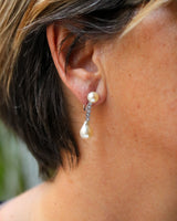 Paire de boucles d'oreilles en or blanc 750/e, se composant en bas d'une perle Baroque et en haut d'une perle ronde, les deux sont reliées par un élément articulé orné de diamants taille ancienne sertis clos et millegrain. Système de fermeture pour oreille non percées à vis. Bijou en bon état et raffiné.