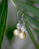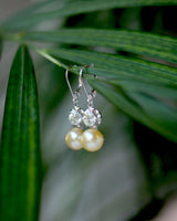 Boucles d'oreilles Dormeuses en or blanc 750 millièmes, ornée chacune d'un diamant taille ancienne d'environ 0,43 carat chacun, sur chaton gaufré ouvragé, suivi d'une perle de culture d'un jolie jaune ivoire d'environ 8 mm de diamètre. Système de dormeuses récent. Bijou en excellent état.