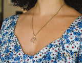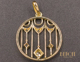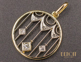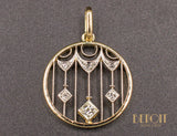 Pendentif ancien en or jaune 750/1000e formant un cercle ajouré au centre duquel des éléments réhaussés de platine sont sertis de diamants taille ancienne et taille rose. Bijou de très belle facture, au style pré-Art Déco. Chaîne sur demande.