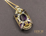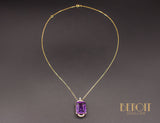 Pendentif ancien en or jaune 585/1000e d'une améthyste violet intense taille émeraude d'environ 17 carats sertie sur quatre griffes de platine, encadrée d'éléments géométriques réhaussés de platine et sertis de petits diamants. Monté sur une chaîne neuve d'or jaune 750/1000e, optionnelle.