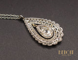 Pendentif en platine en forme de poire. Un petit pendant central est serti d'un diamant taille ancienne coussin d'environ 0,80 carat ainsi que de petits diamants, et est articulé au centre de deux entourages de diamants taille rose et taille ancienne sertis en grains et sertis en clos. Chaîne récente en platine. Bijou de très belle facture.