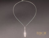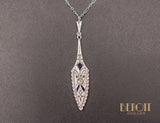 Pendentif de style et d'époque Art Déco en or jaune 750/1000e entièrement réhaussé de platine, composé de différents éléments articulés, ouvragés de motifs guillochés et sertis de petits diamants taille rose ainsi que de calibrés de saphirs synthétiques bleu foncé, avec au centre un diamant taille ancienne d'environ 0,05 carat serti en clos. Riche travail de millegrain, bijou de très belle facture. Chaîne en or blanc 750/1000e, d'origine.