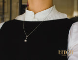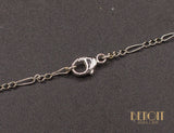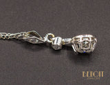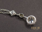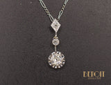 Pendentif ancien en or blanc 750/1000e composé d'une succession de trois diamants : un premier, moderne d'environ 0,06 carat serti sur un losange ; le deuxième, taille ancienne d'environ 0,08 carat serti en clos et enfin le troisième, taille ancienne d'environ 0,45 carat serti sur un chaton gaufré. Pendentif vendu sur sa chaîne en platine d'origine.