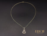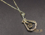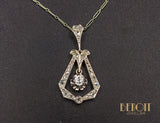 Pendentif en or blanc 750/1000e (18K) réhaussé de platine, dont le chaton gaufré serti d'un diamant taille ancienne d'environ 0,15 carat est articulé au centre d'un motif de ruban. Il est entièrement serti de diamants taille rose et est fermé par un diamant taille rose serti en clos. Pendentif finement travaillé de millegrain, tout comme sa bélière sertie de diamants taille rose où passe sa chaîne d'origine, en or blanc 750/1000e. Poinçons tête d'aigle.