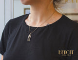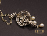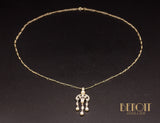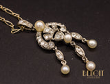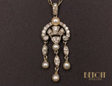 Pendentif en platine de pur style Art Déco, dont le motif central ressemble à un papyrus surmonté d'un arc de cercle et au bout desquels sont suspendues de petites pampilles. Le bijou est entièrement pavé de demi tailles et décoré de cinq perles fines blanches. Chaîne d'origine, en or blanc 750/1000e.