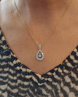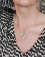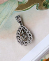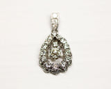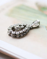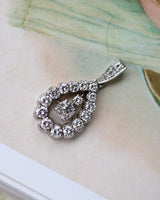 Pendentif en or Blanc 750/e en forme de poire, se compose d'un Diamant Coussin taille ancienne surmonté d'un Diamant rond taille brillant au centre d'un entourage de diamants taille moderne sertis tous sertis griffes. La bélière triangulaire, délicatement pavée de diamants taille moderne sertis clos et grains, ajoute une touche d’élégance supplémentaire. Un bijou de très belle facture. Vendu sans chaîne.