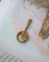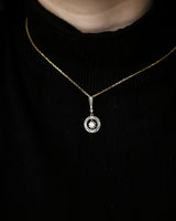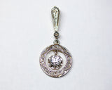 Pendentif en Or Jaune et Blanc 750 millièmes dans le pur style art déco, se composant d'une anneau aux motifs repercés et pavé de diamants taille rose, au centre duquel se loge un diamant taille ancienne serti griffes sur chaton gaufré mobile et d'une bélière en forme de point d'exclamation ponctué de diamants taille rose. Un bijou discret et intemporel en bon état.