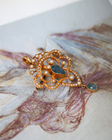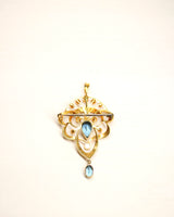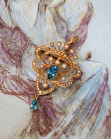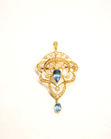 Pendentif et broche en or jaune 585/1000e, typique de l'art nouveau, formé de volutes pavées de demi perles fines dont le centre est orné d'une Aigue Marine poire. A l'opposé de la bélière triangle, est suspendu une Aigue Marine Ovale. Système de broche avec aiguille. Chaîne non fournie, sur commande. Bijou en bon état.
