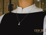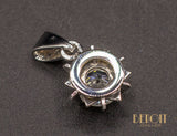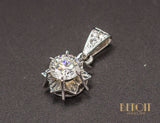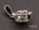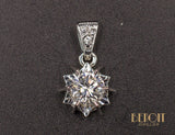 Pendentif solitaire or blanc 750/1000e serti d'un diamant taille moderne d'environ 0,90 carat estimé H-VS sur chaton gaufré 6 griffes en forme d'étoile, tenu par une bélière sertie de 3 diamants sertis en grains. Vendu sans chaîne, mais possible d'en réaliser une sur mesure.