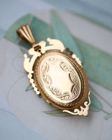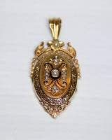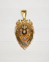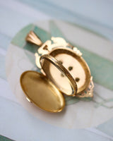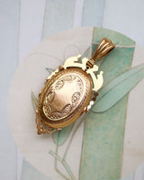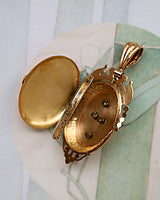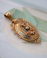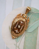 Pendentif ouvrant en or rose 750/1000e, de forme ovale, dont la face est ornée d'un motif en applique serti de demi perles dont celle du centre est soulignée d'un trait d'émail noir. L'ensemble est souligné par un entourage repercé. Le haut et le bas sont agrémentés d'un motif perlé et d'arabesques. On retrouve sur le haut, une fleur amovible ornée d'une perle. Le dos est joliment ciselé. A l'intérieur un verre permet le placement d'une photo ou d'un message. Bélière en triangle. Chaîne non fournie, sur commande. Bijou en bon état.