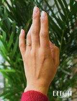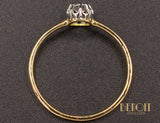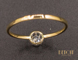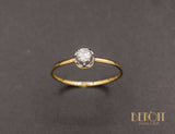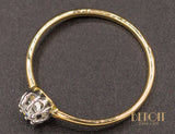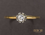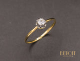 Solitaire ancien orné en son centre d'un diamant rond taille ancienne d'environ 0,15 carat serti dans un chaton gaufré huit griffes de platine, posé sur un corps de bague fin et rond en or jaune 750/1000e. Bijou classique et délicat.