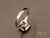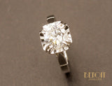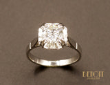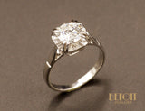 Solitaire en platine serti d'un diamant taille brillant estimé G-Si3 sur chaton gaufré carré à double griffes. Corps de bague ruban simplet décoré un trait de scie de chaque coté et donc les palmettes rejoignent le chaton en pointe. Bijou de belle facture.