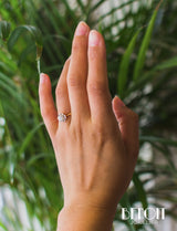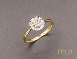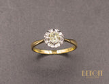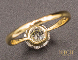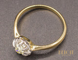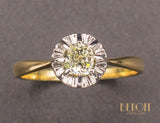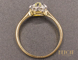 Solitaire ancien en or jaune 750/1000e, ornée d'un diamant jaune taille ancienne coussin, serti sur chaton gaufré 8 griffes en platine.