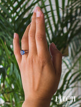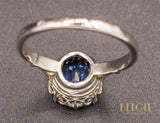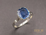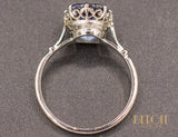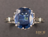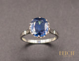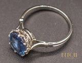 Bague solitaire en platine ornée d'un saphir bleu doux taille coussin de 2,53 carats serti sur un chaton 8 griffes entièrement décoré d'arabesques. Bijou de très belle facture, en excellent état.