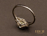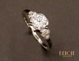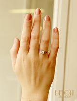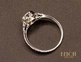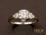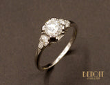 Solitaire en Platine dont la tête de bague est ornée d'un diamant certifié I-Vs1 (HRD) de 0,83ct au centre d'un octogone et de quatre griffes rectangles. De chaque côté, deux escaliers sertis de diamants épaulent le diamant. Le panier est finement ouvragé de volutes. Corps de bague simple ruban en fuite. Bijou de très belle facture.