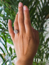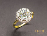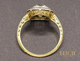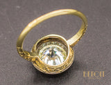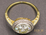 Solitaire ancien en or jaune 750/1000e orné d'un diamant jaune taille ancienne de 2,60 carats certifié HRD M-VS1, serti en clos d'argent, accompagné d'un entourage d'argent guilloché et gravé. Toute la moitié supérieure de l'anneau ainsi que les flancs de la tête de bague sont couverts de gravures de motifs Art Déco. Bijou rare, de très belle facture.