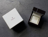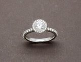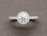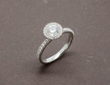 Solitaire d'occasion en platine signé De Beers, modèle "Aura", numéro de série B10369. Diamant central de 0,73 carat, de qualité G/Si1. Pavage de 58 diamants pour un poids total de 0,46 carat. Prix du neuf : 7200€