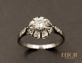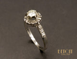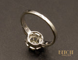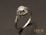 Solitaire ancien en or blanc 750 millièmes serti d'un diamant taille moderne sur chaton gaufré huit griffes de platine, épaulé de deux palmettes, en fuite, pavées de deux diamants demi taille chacune.