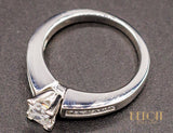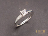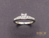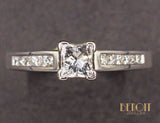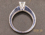Solitaire Moderne en or blanc 585/1000e (14K) ornée en son centre d'un diamant taille princesse d'environ 0,30 carat serti par quatre griffes en coins sur un chaton allongé et épaulé de deux bandes de diamants princesse sertis en rail sur le corps de bague montant et plein. Bijou fin, donnant l'impression d'un bandeau fin et géométrique sur le doigt, idéal pour être porté avec une alliance.