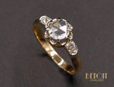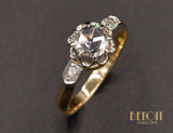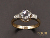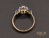 Solitaire ancien en or rose 750 millièmes serti en son centre d'un diamant taille rose d'environ 0,30 carat sur chaton décoré de platine et épaulé de deux diamants sur réhaut de platine. Corps de bague demi jonc, simple.