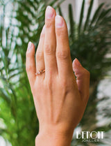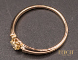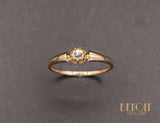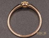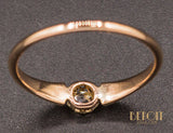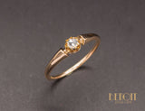 Petit solitaire en or rose 750/1000e typique du milieu du XIXe siècle, ornée en son centre d'un diamant taille rose ronde serti sur un chaton gaufré 8 griffes. Le corps de bague est un jonc fin interrompu par le chaton, joint par un fil plus fin encore donnant une impression de flottement à la pierre centrale.