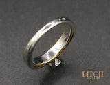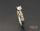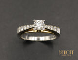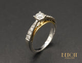 Bague en or blanc 750 millièmes dont le diamant central taille moderne, est serti par un chaton quatre griffes. De chaque côté, les palmettes sont pavées de diamants et laissent apercevoir le repos de doigt en or jaune 750 millièmes. Corps de bague ruban. Bijou moderne.