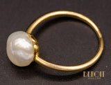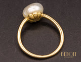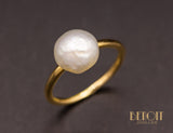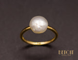 Solitaire en or jaune 750/1000e au design épuré, orné d'une imposante perle baroque blanche. Corps de bague fil rond.