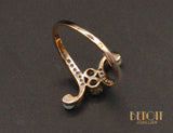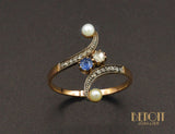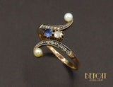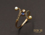 Bague en or rose 750/1000e ornée en son centre d’un diamant taille rose et d’un saphir rond sertis sur 2 chatons décorés. De part et d’autre, deux perles blanches terminent deux tourbillons rehaussés d’argent et sertis de diamants taille rose dans un travail de millegrain. Anneau simple.