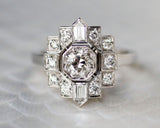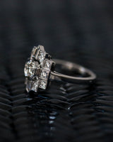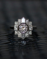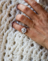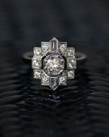 Bague création Benoit Joaillier, en or blanc 750/1000e dont le centre est orné d'un diamant rond taille ancienne de 0,41 carat, serti en clos et grains, entouré d'un pavage diamants taille brillant sertis chacun dans des clos et grains de forme carré et ponctué par deux diamants bullet pointe vers l'extérieur comme pour servir de bousole. Corps de bague fin de section carrée.