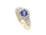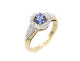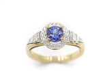 Bague Création en or jaune 750 millièmes ornée d'un saphir de Ceylan, chauffé, rond de 0,77 ct serti sur quatre griffes. Il est entouré de diamants taille brillant, sertis avec millegrain sur or blanc 750 millièmes.