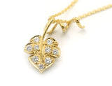 Pendentif en or jaune 750 millièmes représentant une feuille de vigne entièrement pavée de diamants taille brillant, dont la bélière semble s'enrouler autour de la chaine, comme une liane. Chaine en or jaune 750 millièmes en maille forçat ronde.