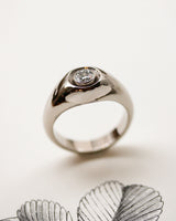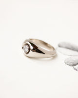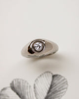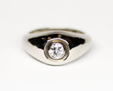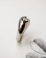 Bague en or blanc 750 millièmes, se composant d'un jonc en fuite orné au centre en tête d'un diamant taille ancienne (inclusions noires sur couronne) serti creux en clos. Bijou en très bon état.