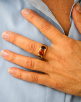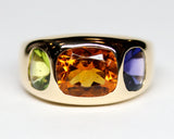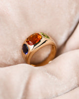 Bague en or jaune signée "Chanel" de la collection Baroque, ornée de trois belles pierres, au centre une citrine orange et, de part et d'autre, une améthyste et un péridot, taille coussin, serties dans la masse du corps de bague joliment bombé sur le haut et repartant en fuite. Un modèle rare numéroté en très bon état.