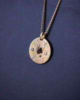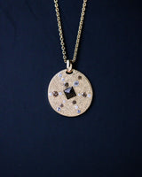 Médaille Talisman en or jaune 750 millièmes signé De Beers, se composant d'un plateau rond délicatement martelé, orné au centre d'un diamant brut Yellow et entouré de diamants taille brillant blancs et de couleur, tous sertis poinçon. La médaille est monté sur une chaine maille forçat diamantée de 45 cm de longueur fermoir menotte. Numéroté 867651. Très bon état