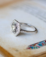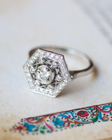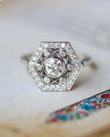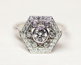Bague Création Benoît Joaillier en or blanc 750 millièmes orné d'un diamant taille brillant 0,45 ct estimé environ H-Si, serti en clos au centre d'un plateau hexagonale, composé d'un premier entourage ajouré ponctué de diamant taille brillant sertis en clos et d'un deuxième pavé de diamants taille brillant sertis clos et grains. Palmettes serties de diamants taille brillant. Panier ajouré et corps de section carré.