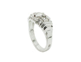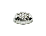 Bague modèle "Art Déco" en or blanc 750/1000e, inspirée des bijoux de Jean Desprès et de l'architecture Art Déco. Diamant central de 0,20ct serti par six grains dans un hexagone et épaulé d'un pavage d'environ 0,25 carat.