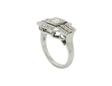 Bague en or blanc 750/1000e, au motif géométrique et aéré inspiré de l'Art Déco. Serti en grains dans un carré, son diamant central d'environ 0,55 carat estimé H-Si est entouré d'un pavage de diamants d'environ 0,20 ct au total.