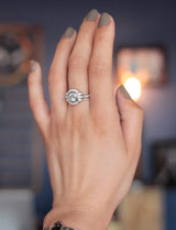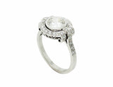 Bague création Benoit Joaillier en or blanc 750/1000e, avec en son centre un diamant rond taille brillant de 1,04 carat, certifié H-VS1, serti en clos , accompagné d'un entourage de diamants et épaulé de motifs Art Déco pavés de diamants se fondant avec l'anneau. Travail de millegrain et panier ouvragé.