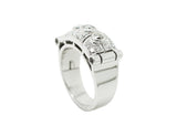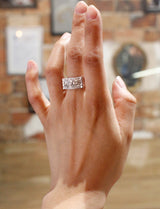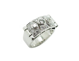 Bague en or blanc 750/1000e, ornée de trois diamants sertis en clos, pour un total de 0,46 carat. Le motif, pris entre deux godrons, est pavé de diamants sertis en grains, avec un travail de millegrain. Bijou inspiré d'un modèle des années 1930.