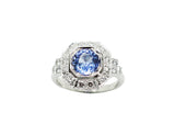 Bague Création Benoit Joaillier en or blanc 750/1000e, sertie en son centre d'un saphir bleu rond de 1,37 carat, serti double grains dans un carré pans coupés. Entourage diamants d'inspiration Art Déco. Corps de bague simple et demi rond.