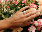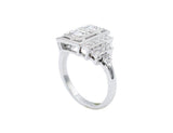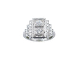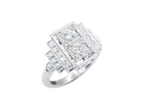 Bague Création Benoit en or blanc 750/1000e, dont le plateau central est serti de deux diamants sertis en grains et placé au centre d'un rectangle ajouré et épaulé de chaque côté de trois marches en escalier pavées de diamants.
